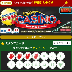 モッピービンゴでは早くビンゴしても獲得ptが変わらないばかりか、早くパーフェクトになってしまうとルーレットが回せず、スタンプゲット出来ないので、ほんの少し損します。